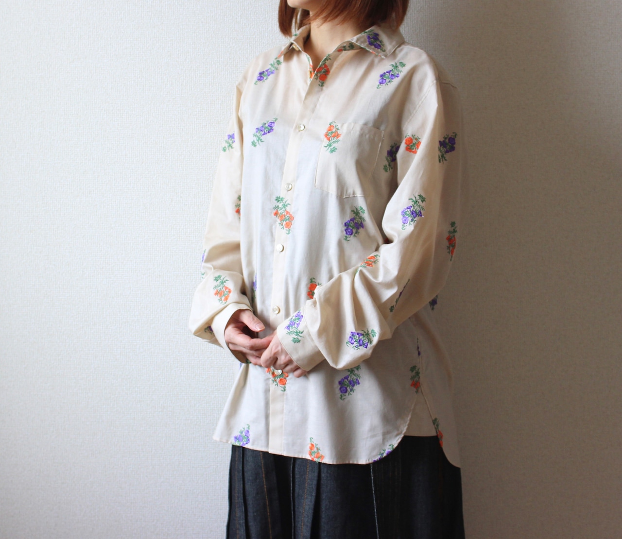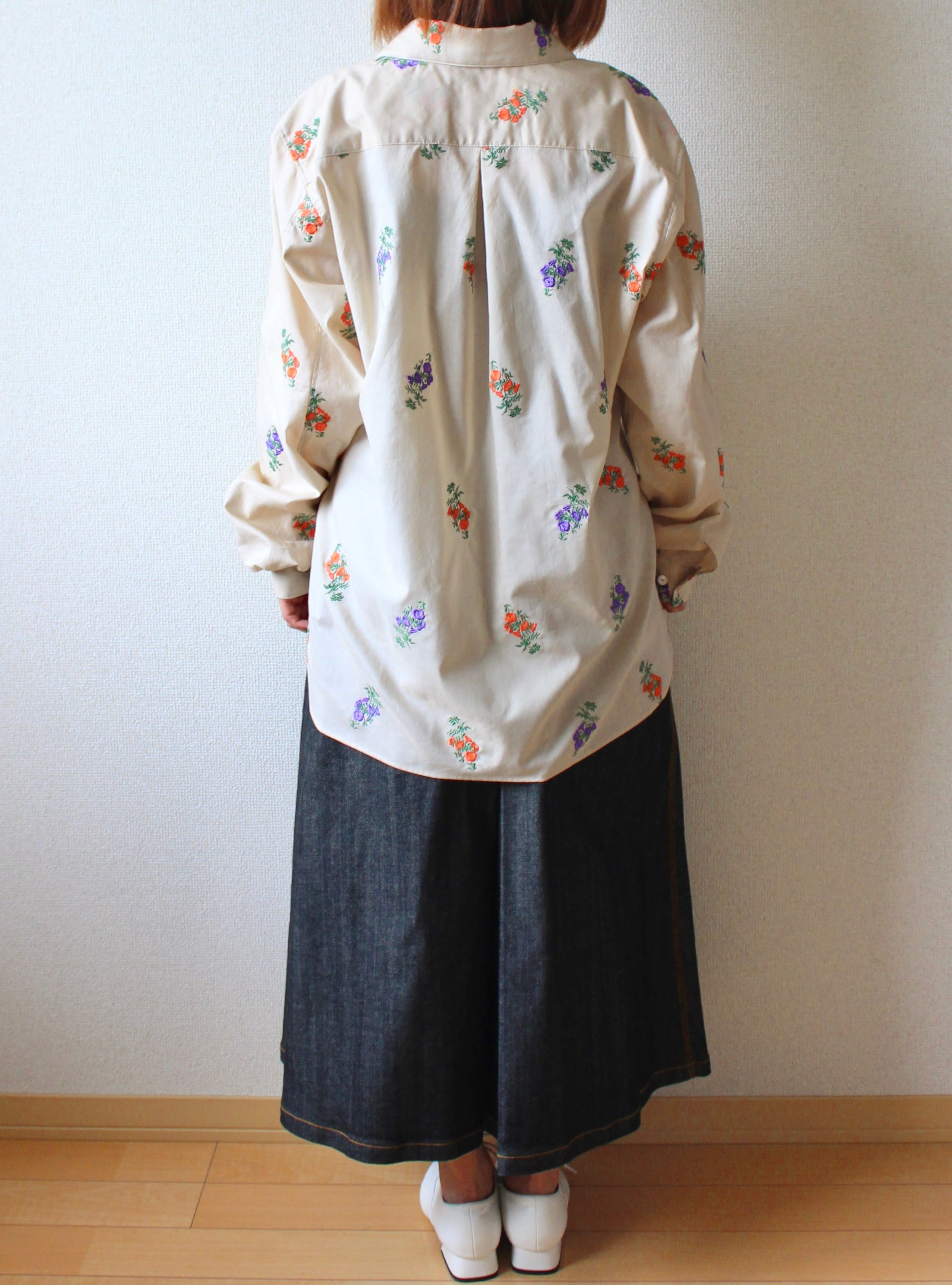 ノウゼンカズラを刺繍で描いた生地で作ったシャツです。