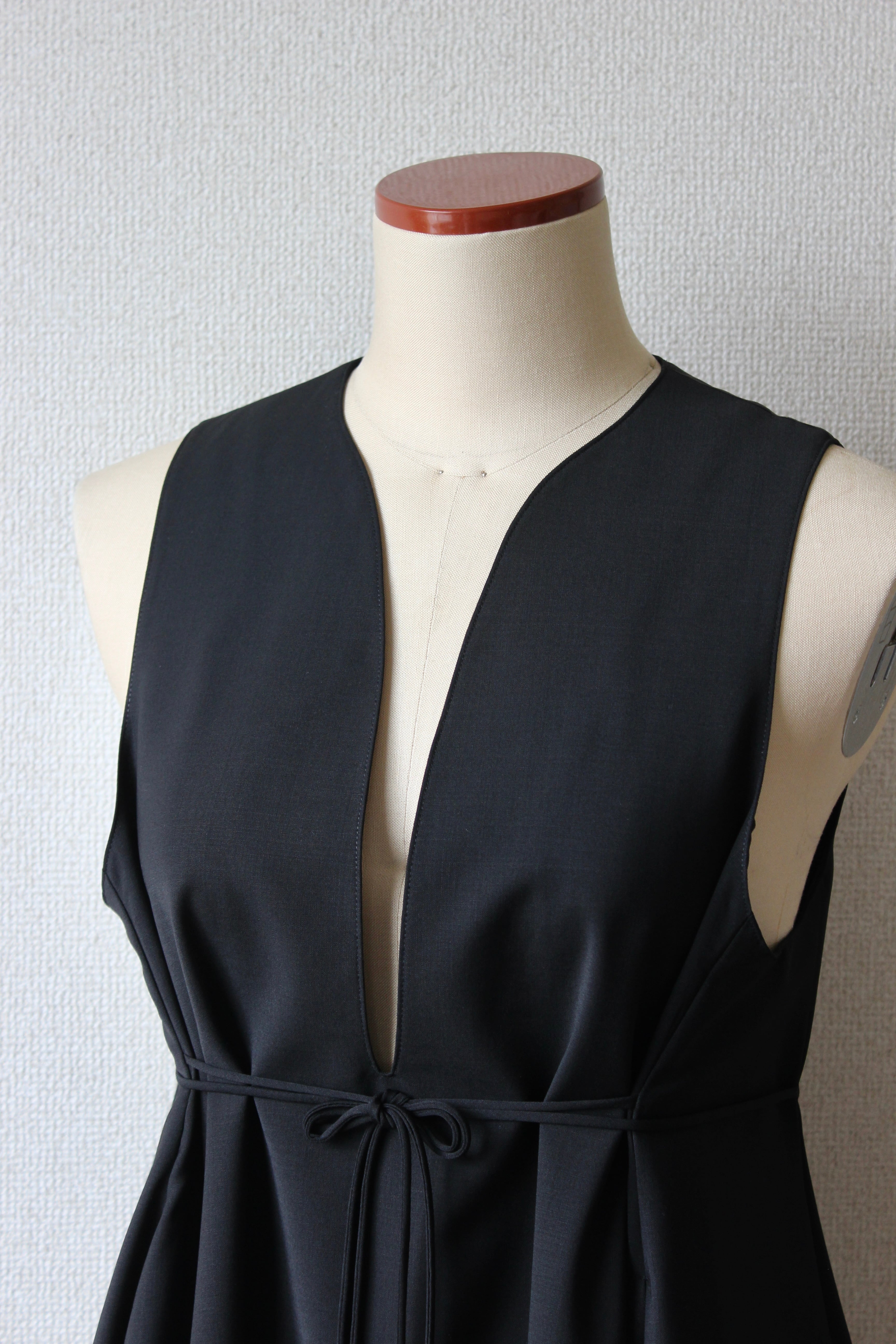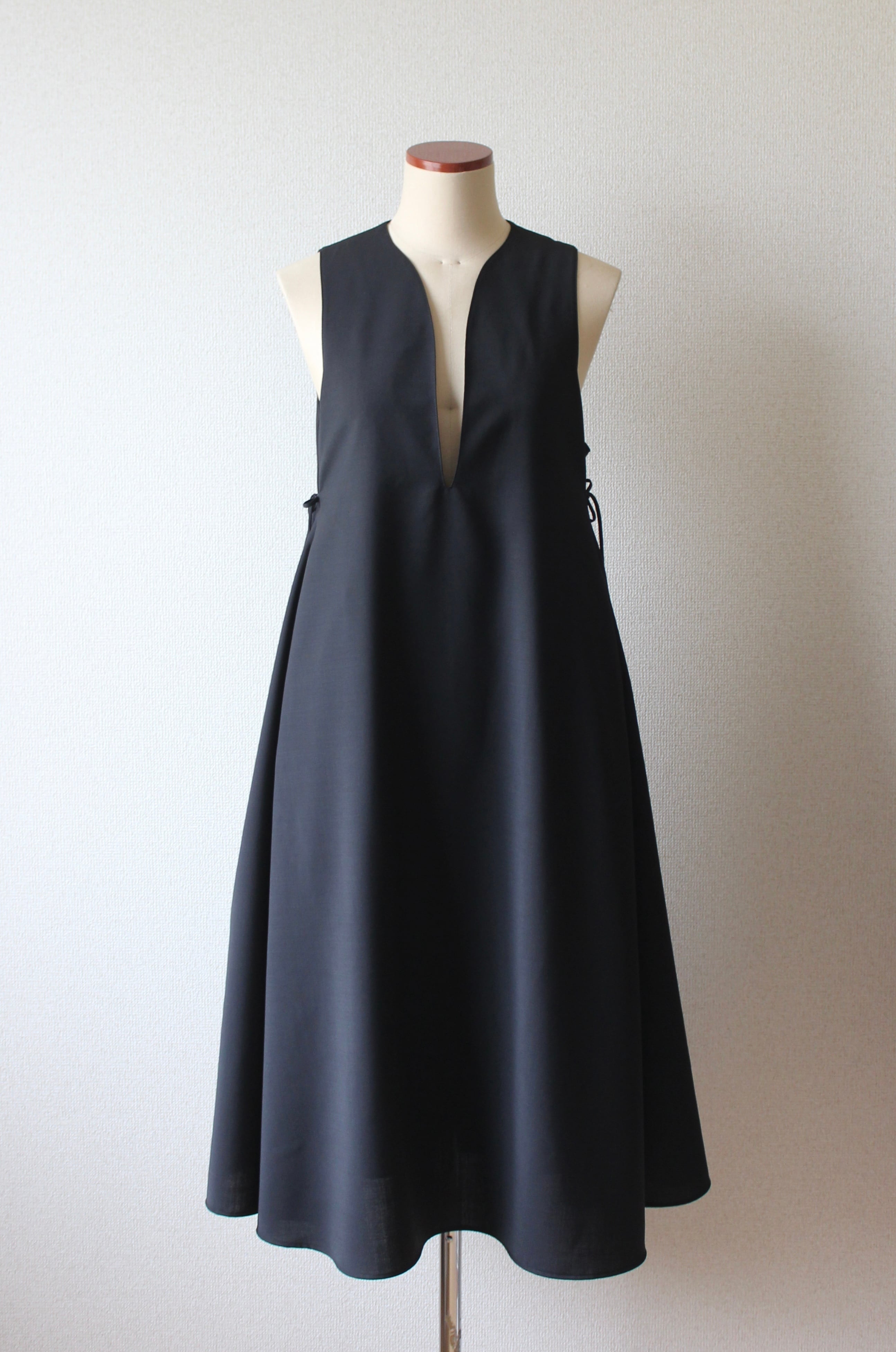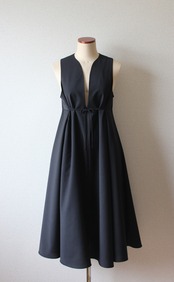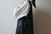 両脇についた紐で花束のように結ぶことでシルエットに表情を加えることができるジャンパースカートです。
