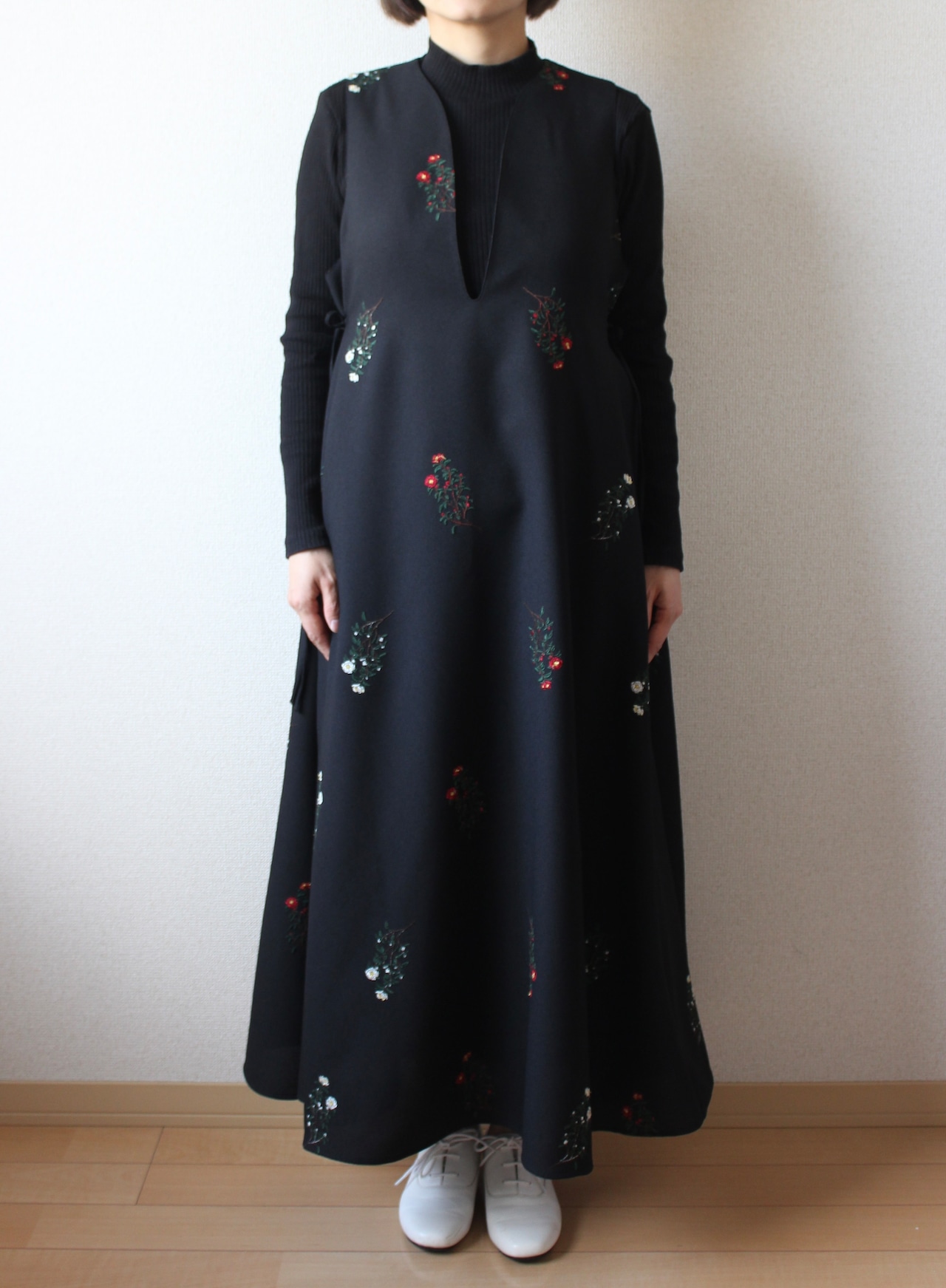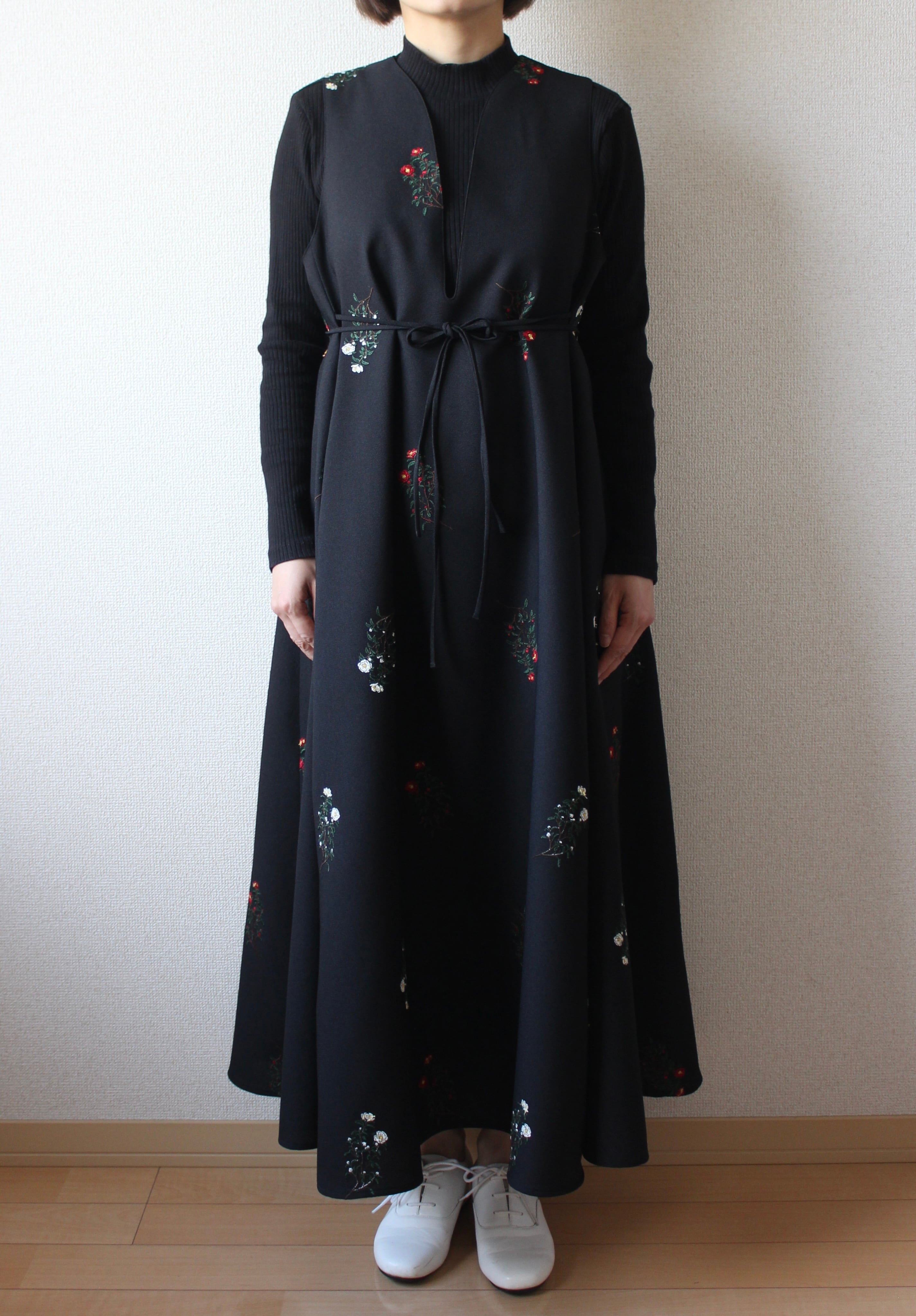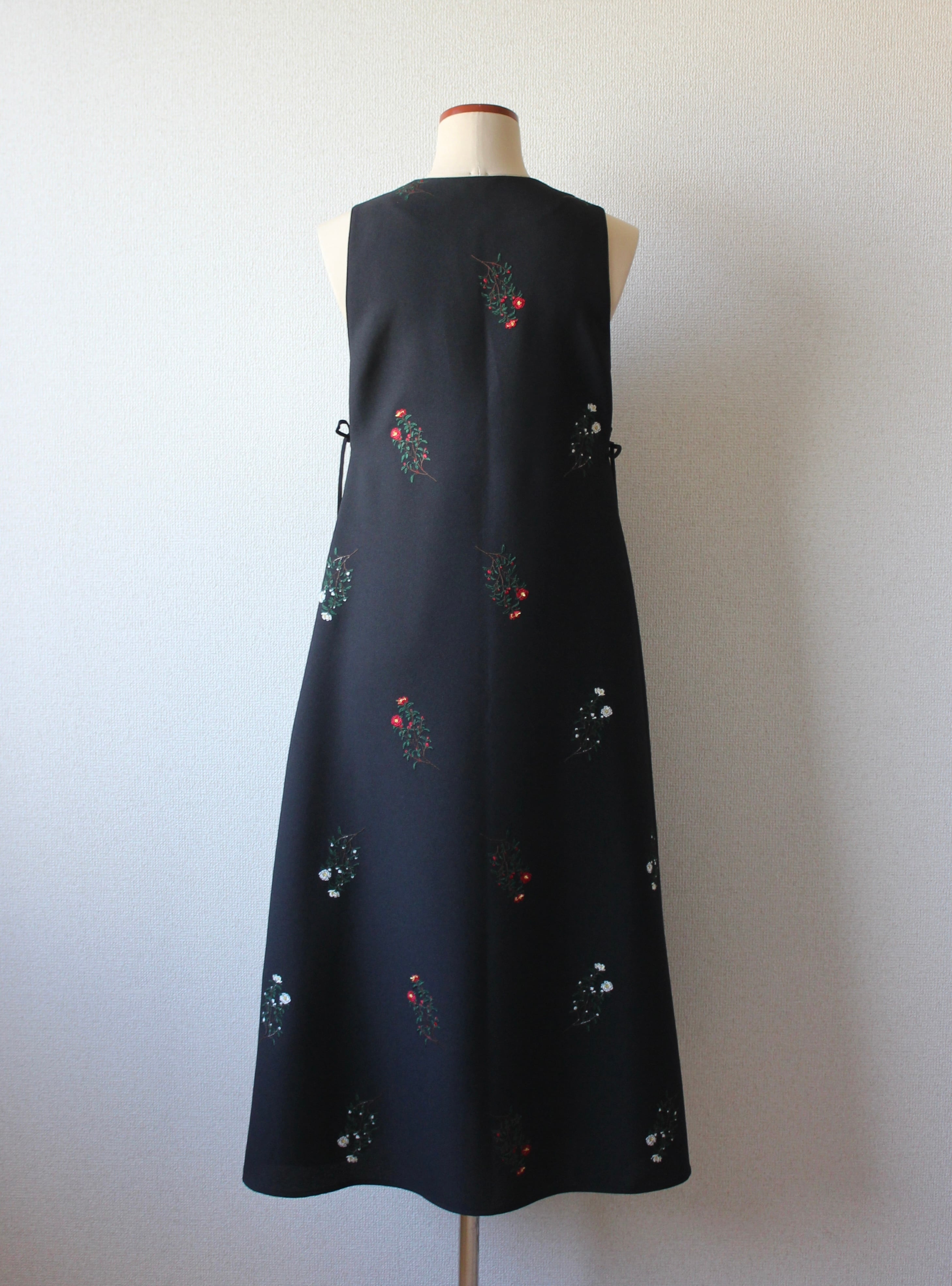 山茶花を刺繍で描いた生地で作ったジャンパースカートです。