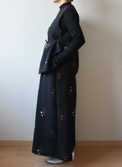 裾に向かって緩やかな広がりを入れたシルエットになっており、脇に縫い付けた紐は前後どちらでも結ぶことが出来、それぞれ違った表情を見せてくれます。