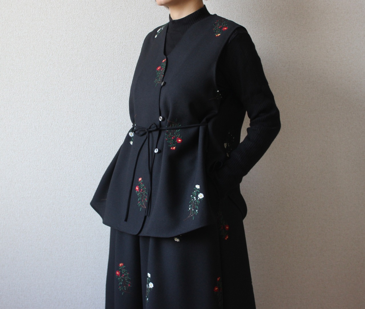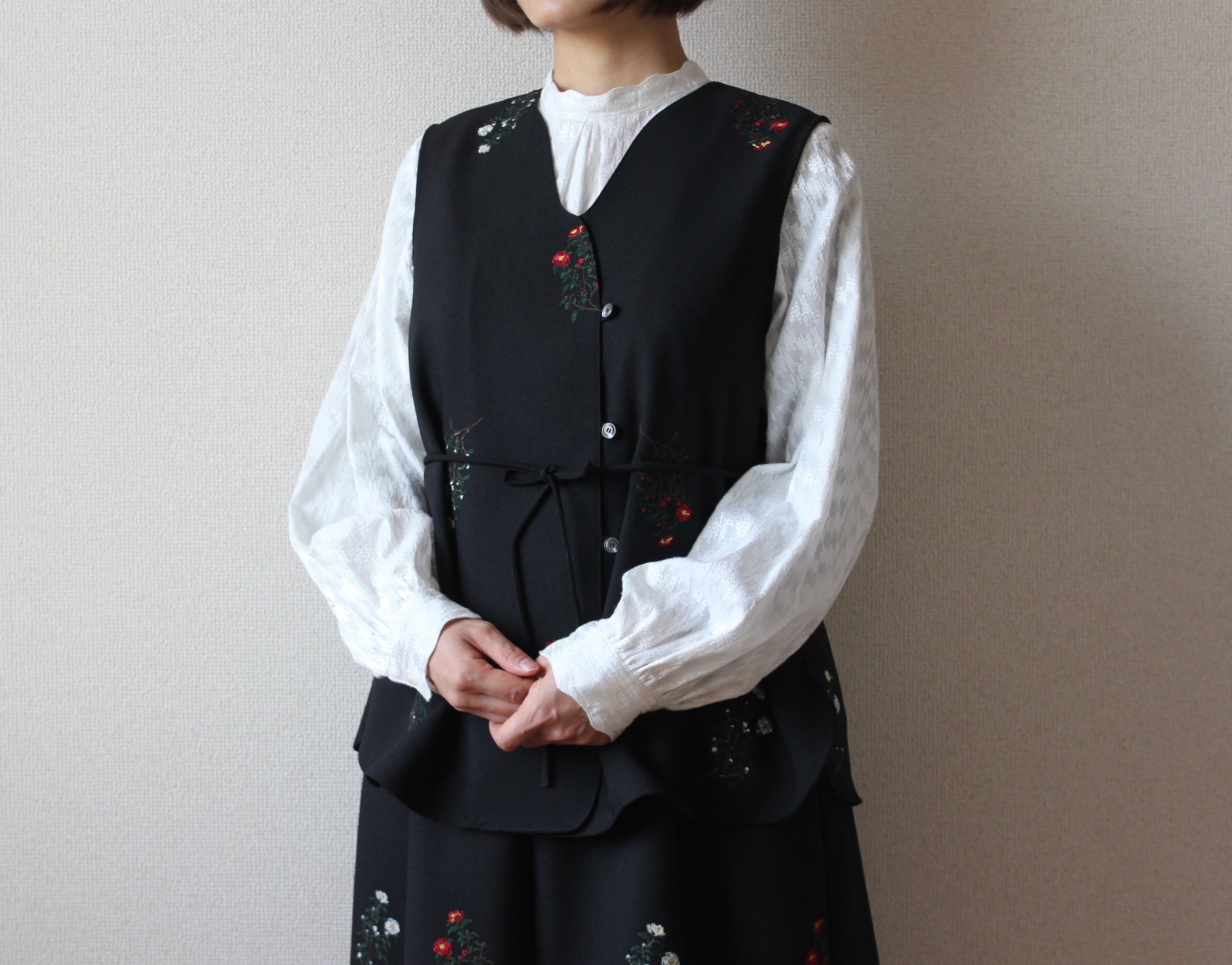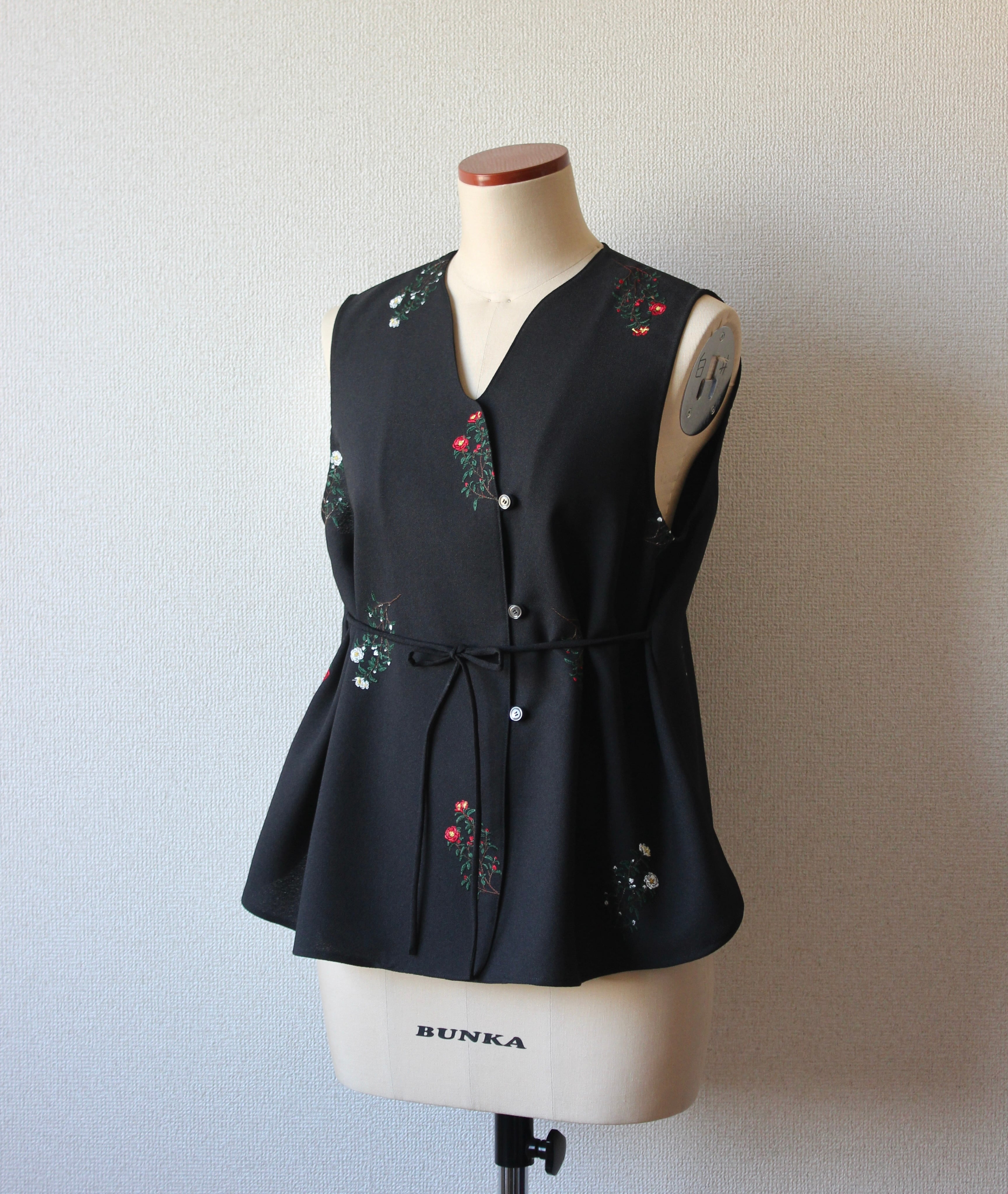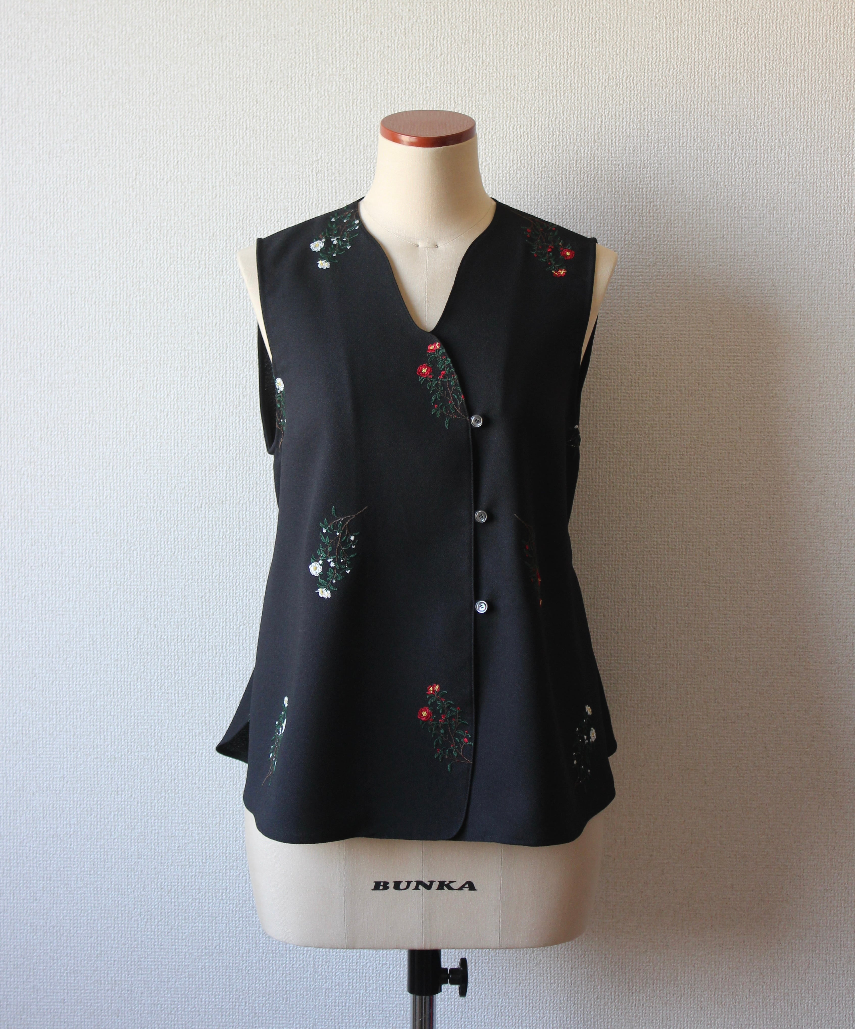 山茶花柄の刺繍生地で製作した首元の曲線が特徴のベストです。