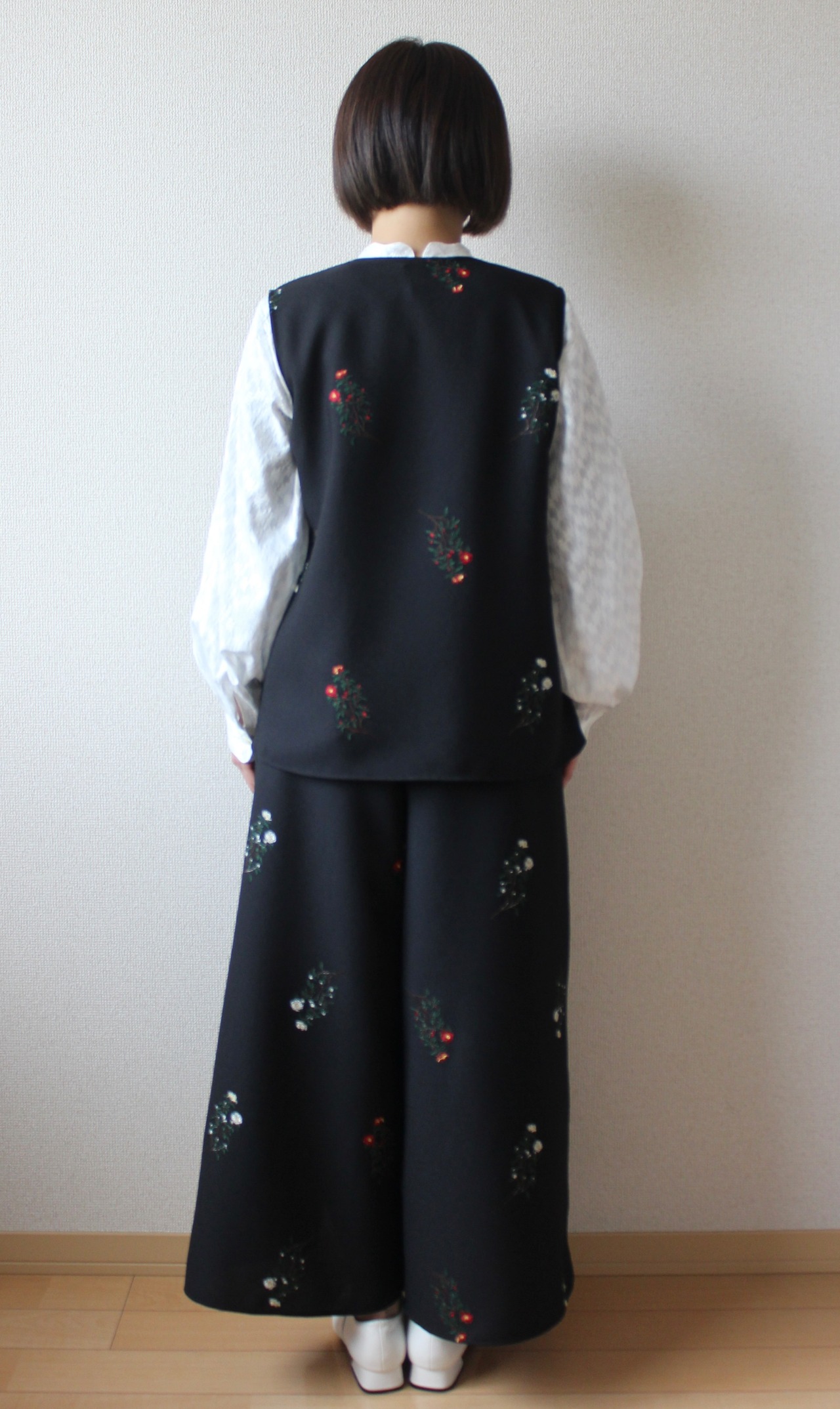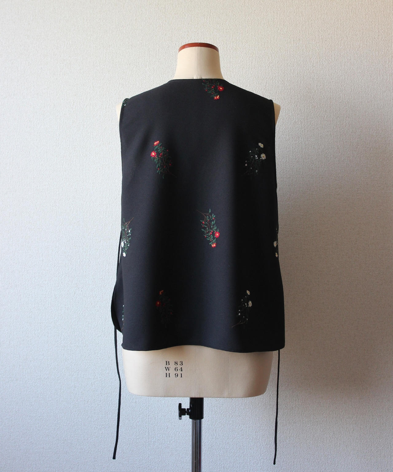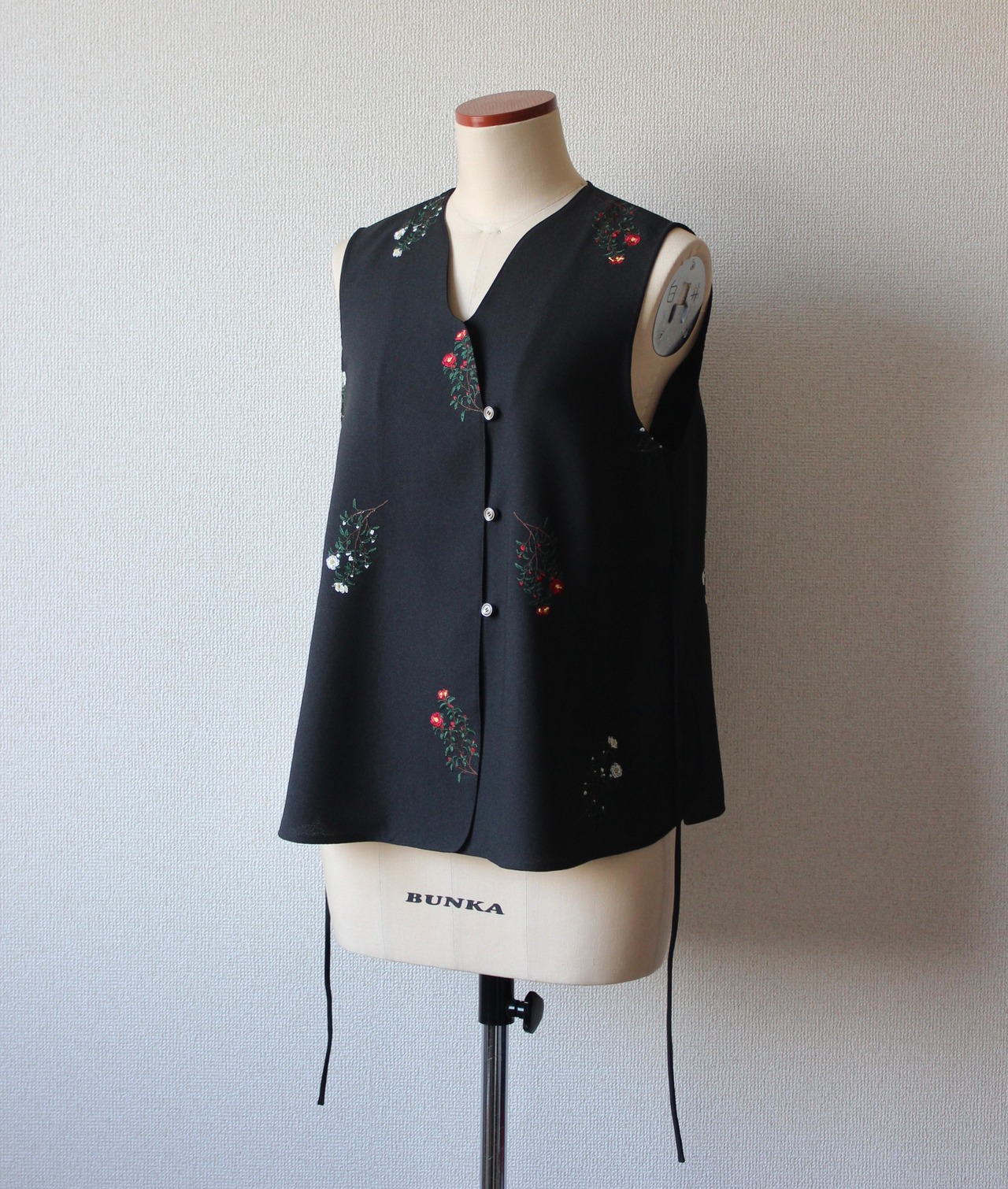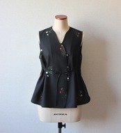 山茶花柄の刺繍生地で製作した首元の曲線が特徴のベストです。