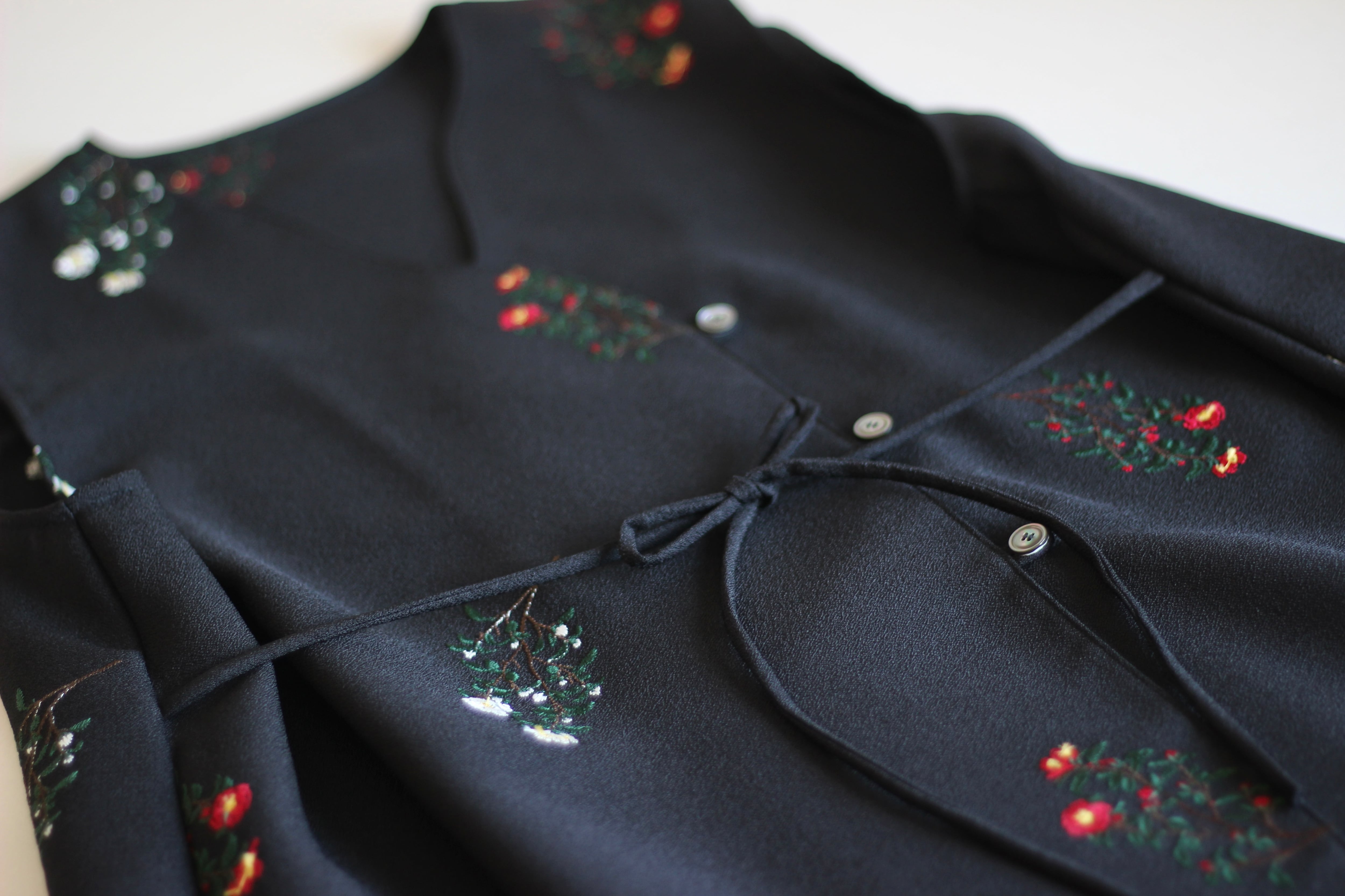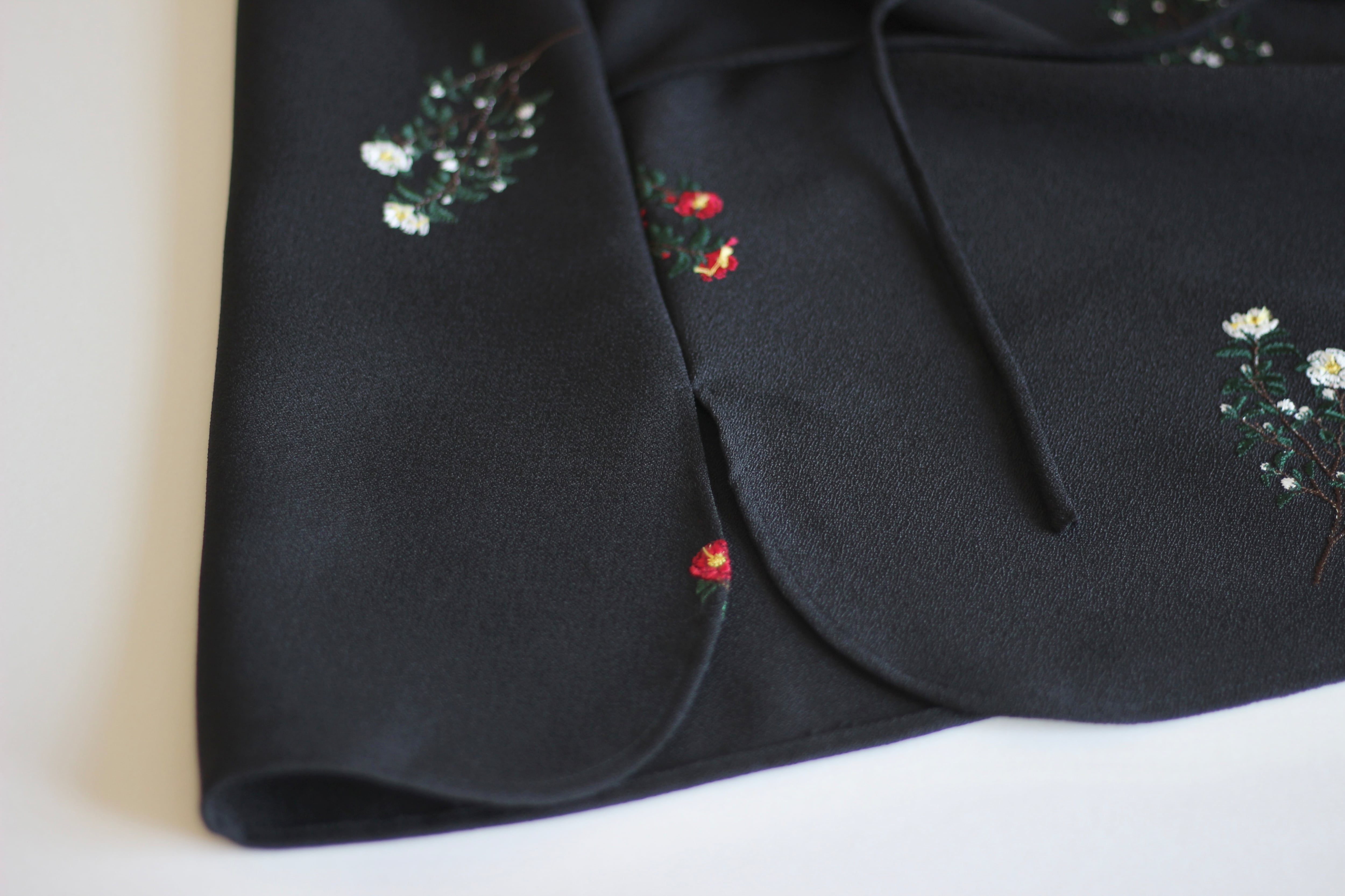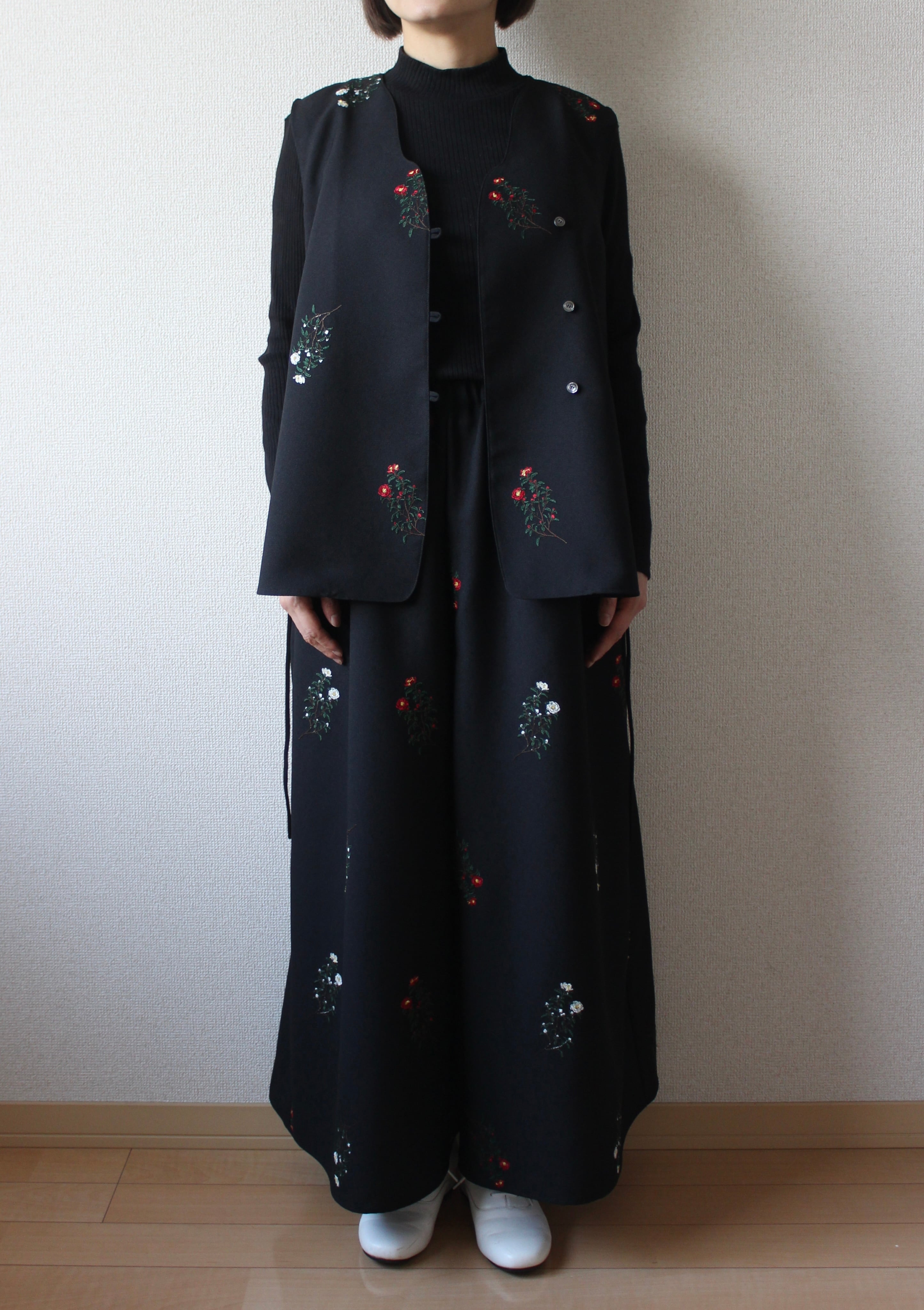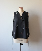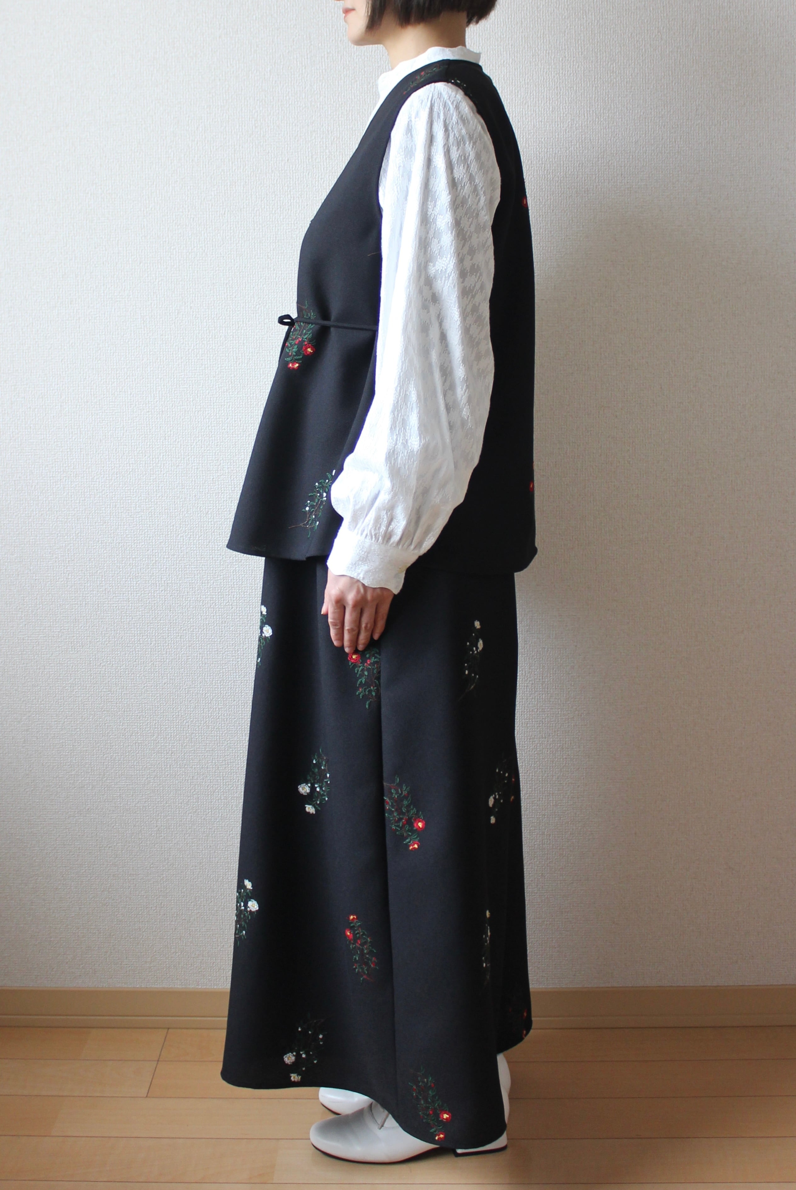 山茶花柄の刺繍生地で製作した首元の曲線が特徴のベストです。